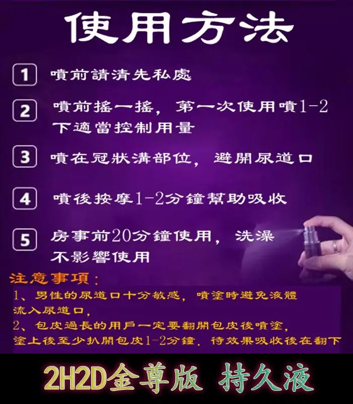2H2D金尊版持久液 是專為男性設計的高效外用持久產品,旨在延長性愛時間,提升持久力,讓您在親密時刻展現最佳狀態。這款持久液採用多種天然成分,專門針對男性敏感度問題設計,能有效延遲射精,增強性愛品質,讓您和伴侶享受更長久、更滿足的親密時光。