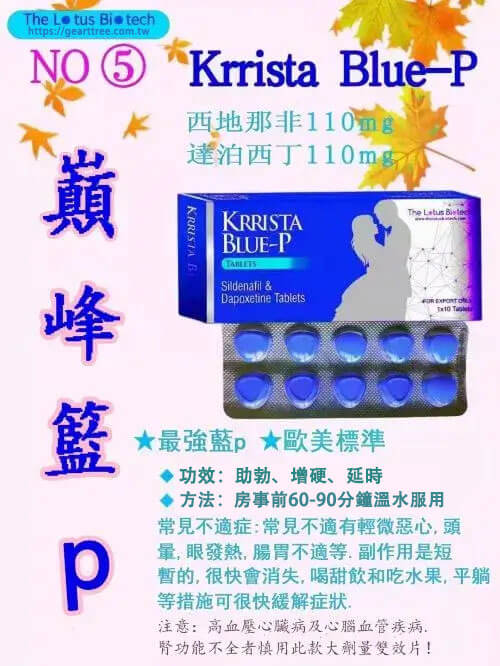 在追求極致性愛表現的男性族群中,「印度巔峰藍P(KRRISTA BLUE-P)」堪稱一款高效能的熱門選擇。結合助勃成分西地那非(Viagra)與延時成分達泊西汀(Priligy),一次解決勃起障礙與早洩困擾,帶來雙重保障。不論是應對硬度不足還是快速射精,藍P雙效片都能助你找回掌控力。本文將完整介紹其成分功效、使用方法、副作用與注意事項,讓你在使用前全面了解、安心入手。