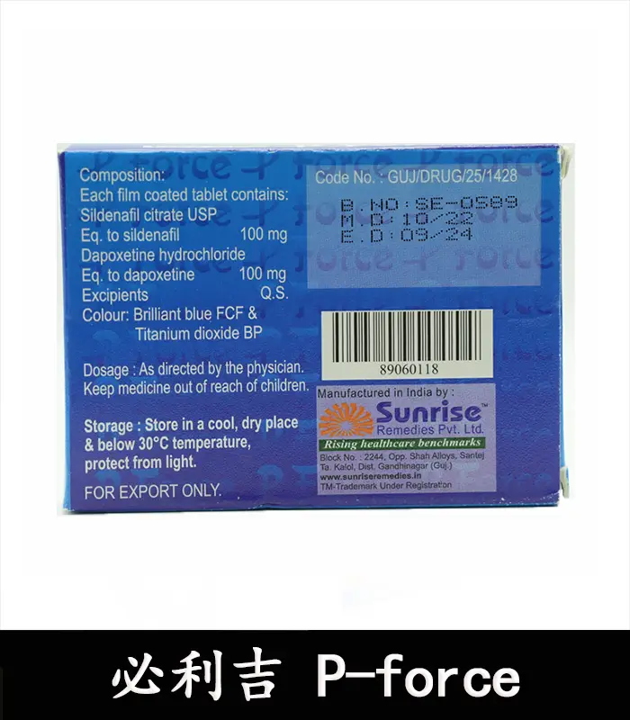 必利吉是一種壯陽藥,也被稱為p-force、雙效威而剛和藍色小藥丸。它分為藍色版本(藍P)和綠色版本(綠P),是由印度桑瑞製藥公司研發的具有助勃延時壯陽三效合一的雙效壯陽藥。它的主要成分是含有100mg西地那非和100mg達泊西汀,由於價格便宜且效果強勁,也被稱為超級威而剛。目前,在全球的知名度非常高。